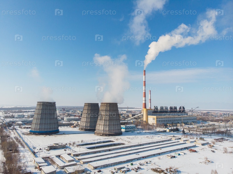 Пейзаж дымящихся труб заводов в промышленном городе, солнечная красота зимнего дня. Концепция опасной экологии в городе, дым и смог от заводов и фабрик