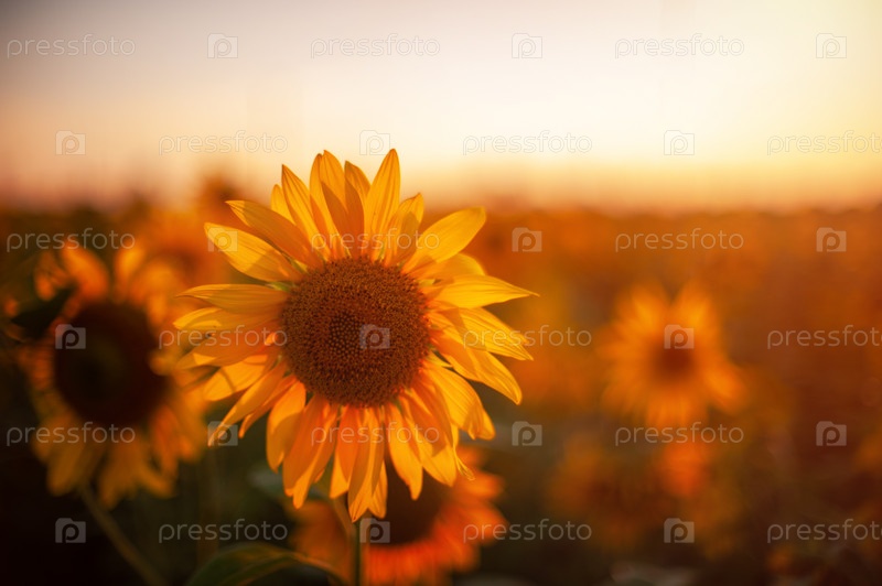 Подсолнух крупным планом на фермерском поле на закате летом