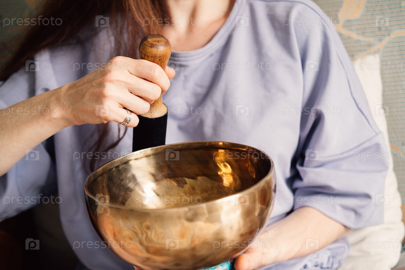 Крупный план рук женщины, играющей на тибетской поющей чаше, символизирующей осознанность