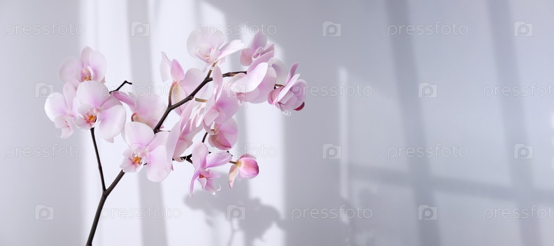 Красивый цветочный фон. Розовые орхидеи фаленопсис на светлом фоне. Тени на стене. Избирательный фокус. Копировать пространство