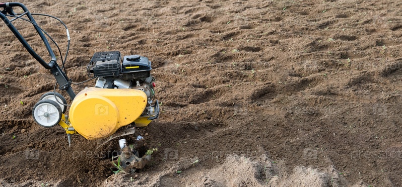 Культиватор пашет землю. Концепция органического земледелия. Баннер