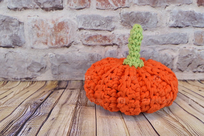 Оранжевая вязаная тыква с зеленым стеблем на деревянном полу
