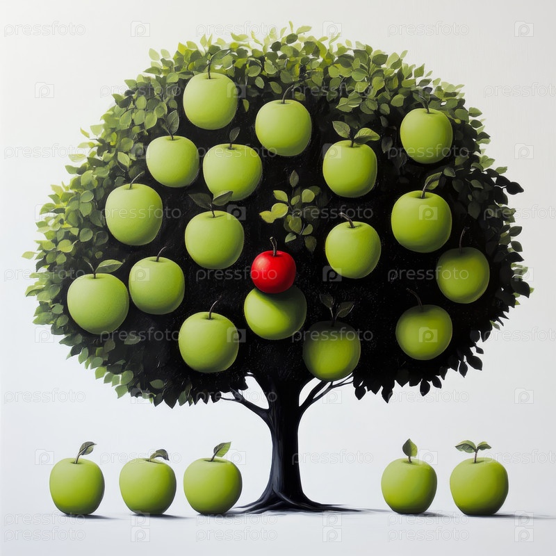 Декоративное дерево с ярко-зелеными и красными яблоками, выполненное в качестве настенного украшения