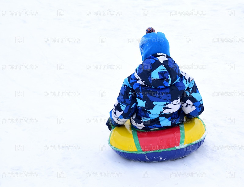 Маленький мальчик катается со снежной горки на надувной ватрушке