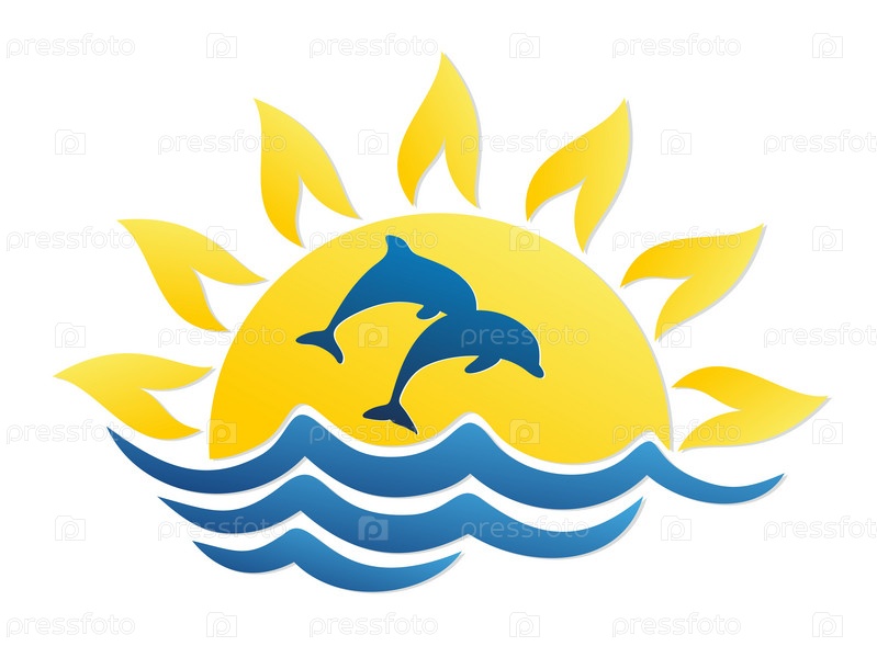 Логотип рассвета солнца в море с дельфинами