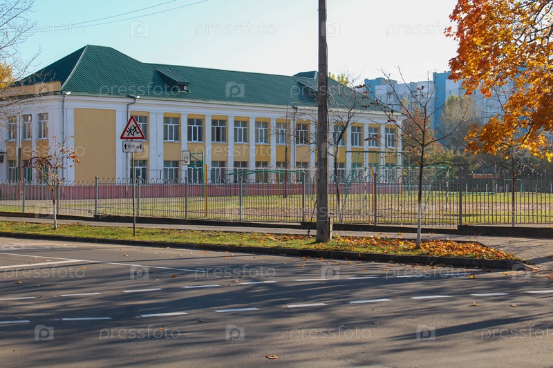 Двухэтажное здание школы осенью. Спортивная площадка на территории школы. Перекресток, пешеходный переход