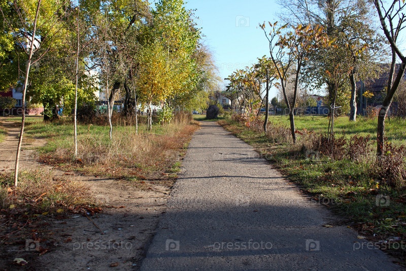 Асфальтовый тротуар с осенними деревьями и листьями. Желтая атмосфера