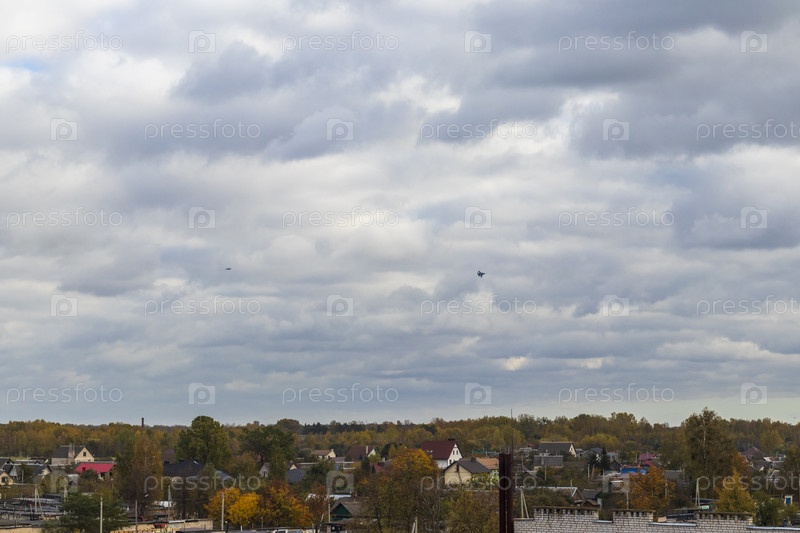 Силуэты истребителей МИГ в облачном небе. Военные