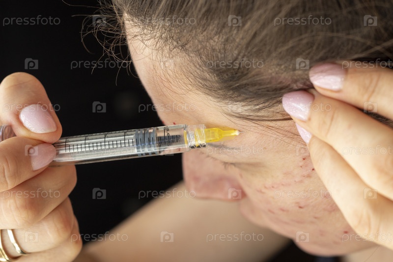 Женщина проводит мезотерапию, процедуру биоревитализации, инъекции лекарств в шею и лицо. Косметика