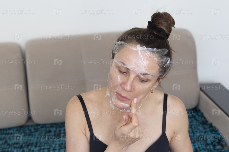 Женщина обматывает лицо и шею пищевой пленкой в качестве процедуры по уходу за кожей. Косметика