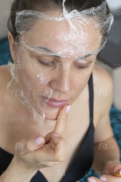 Женщина обматывает лицо и шею пищевой пленкой в качестве процедуры по уходу за кожей. Косметика