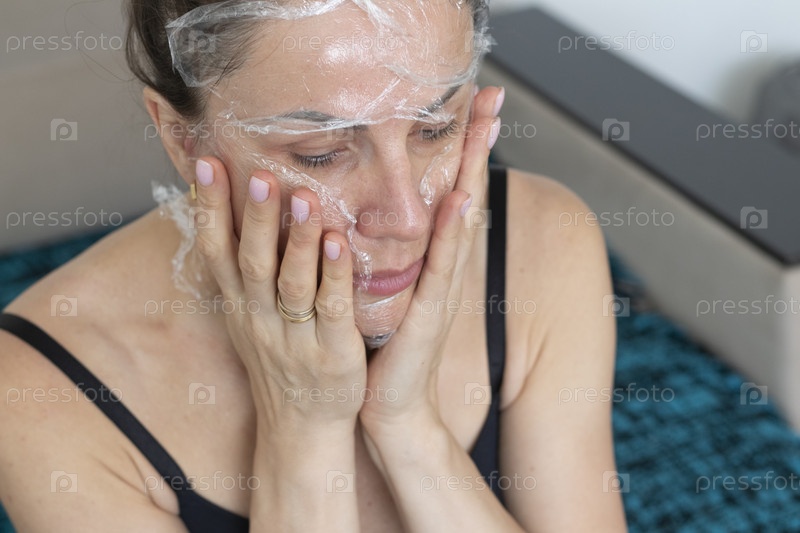 Женщина обматывает лицо и шею пищевой пленкой в качестве процедуры по уходу за кожей. Косметика