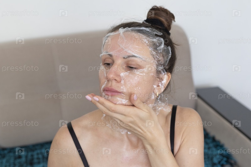 Женщина обматывает лицо и шею пищевой пленкой в качестве процедуры по уходу за кожей. Косметика