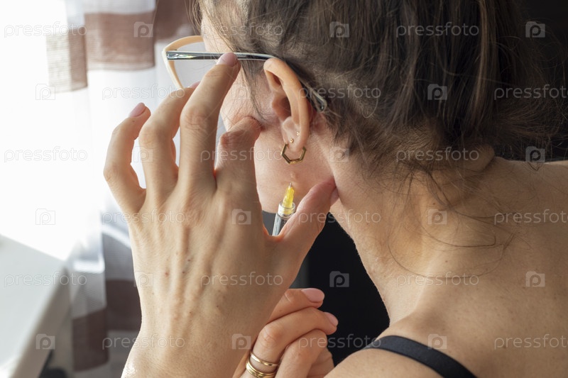 Женщина проводит мезотерапию, процедуру биоревитализации, инъекции лекарств в шею и лицо. Косметика