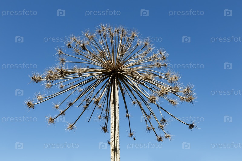 Борщевик Сосновский, Heracleum sosnowskyi. сухие соцветия растений борщевика на синем фоне. высушенный цветок на фоне голубого неба