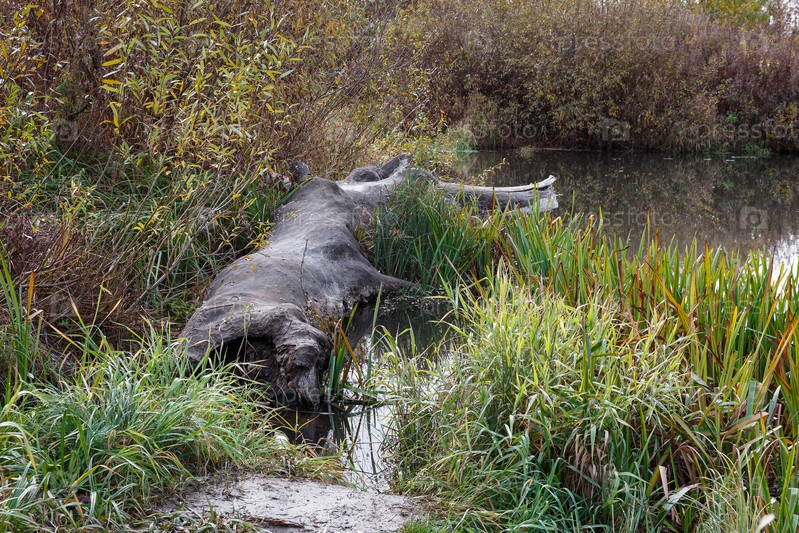 Ствол дерева, лежащий в траве на берегу реки
