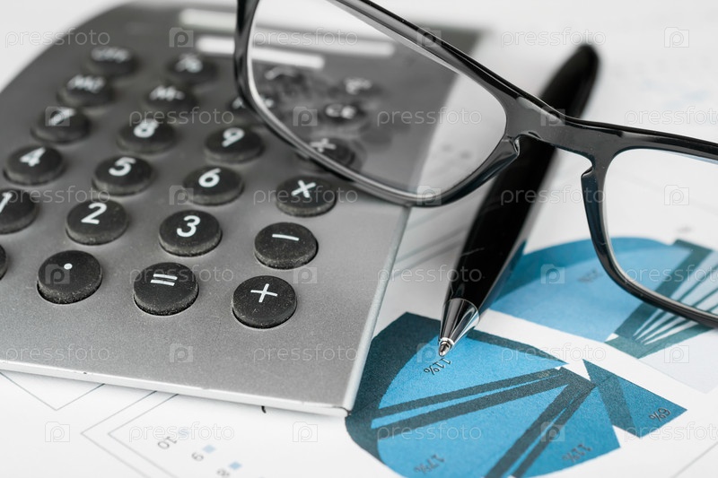 Ручка, калькулятор и очки на фоне диаграмм