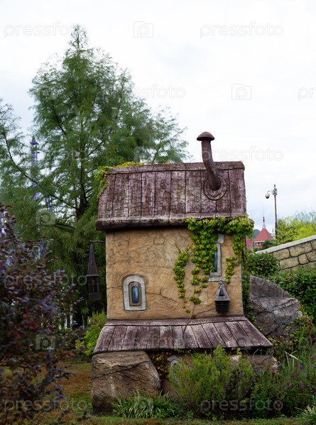 Старый дом в парке с деревьями и зеленой травой на лужайке в Сочи Парке в Адлере летом
