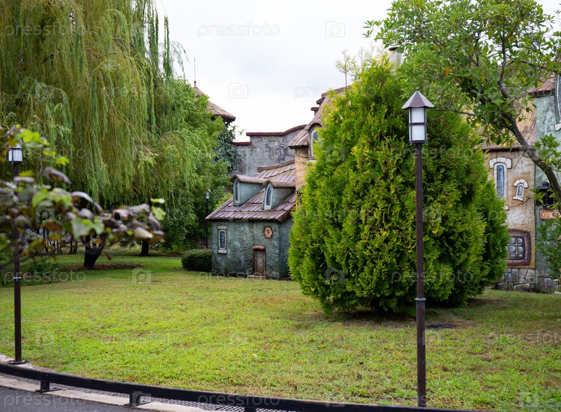 Старый дом в парке с деревьями и зеленой травой на лужайке в Сочи Парке в Адлере летом