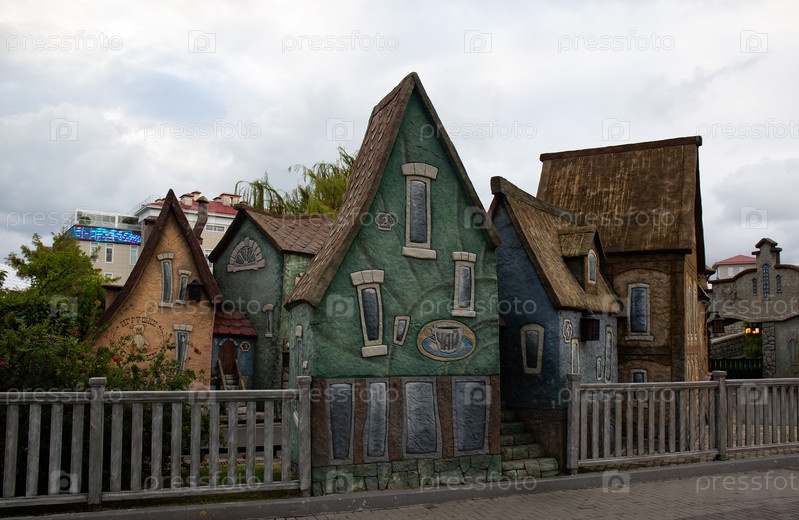 Старый дом в парке с деревьями и зеленой травой на лужайке в Сочи Парке в Адлере летом