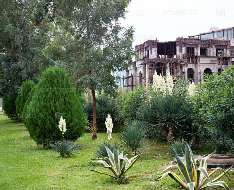Сад с растениями алоэ вера и старым зданием на заднем плане в Сочи-парке в Адлере летом