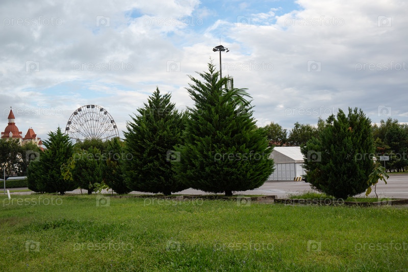 Сосна и колесо обозрения на фоне парка в Сочи Парк в Адлере летом