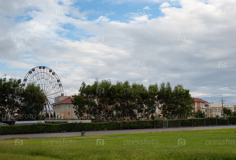 Сосна и колесо обозрения на фоне парка в Сочи Парк в Адлере летом