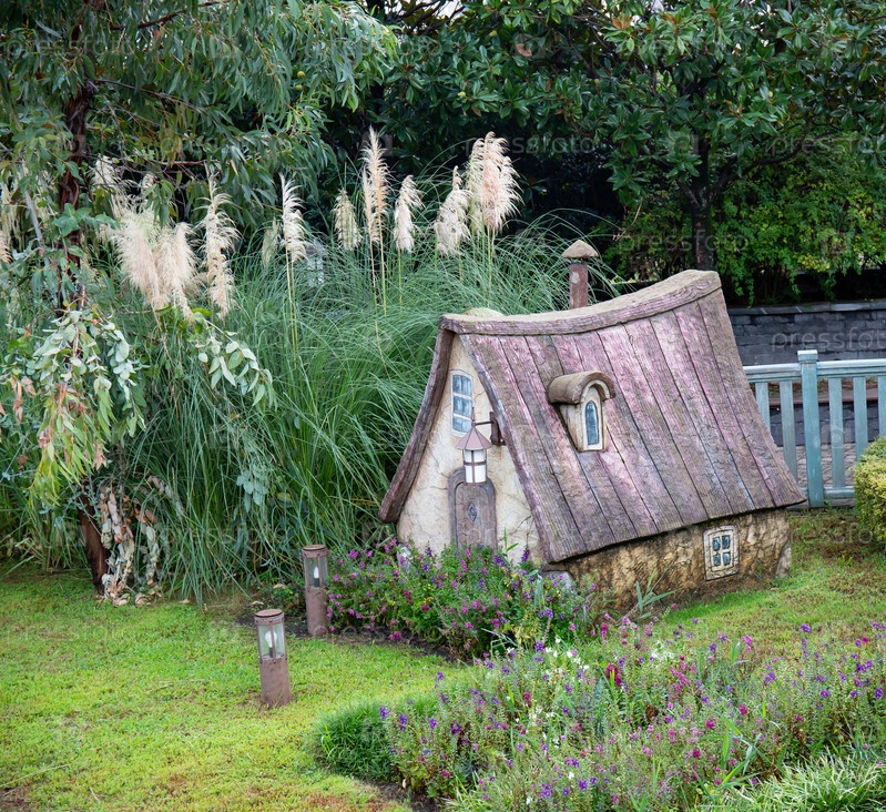 Старый дом в парке с деревьями и зеленой травой на лужайке в Сочи Парке в Адлере летом