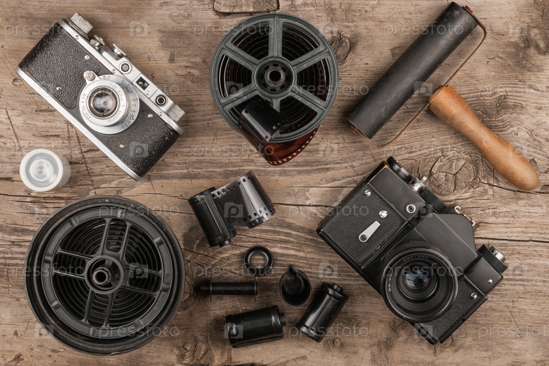 Старые камеры, проявочный бачок, ленты, пленка и ролик для фотографий