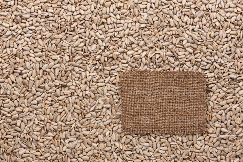 Бирка из мешковины лежит на фоне семян подсолнечника