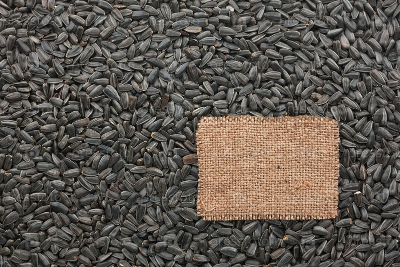 Бирка из мешковины лежит на фоне семян подсолнечника