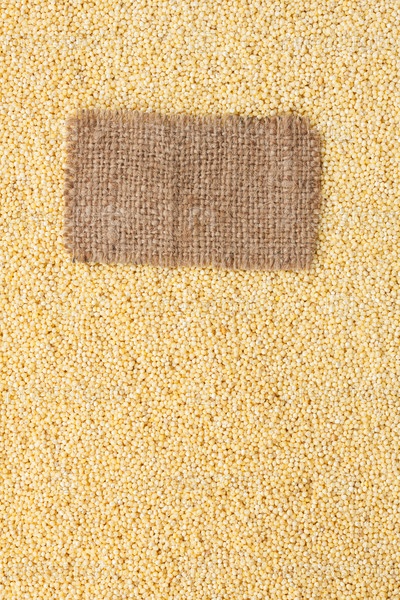 Бирка из мешковины лежит на фоне проса