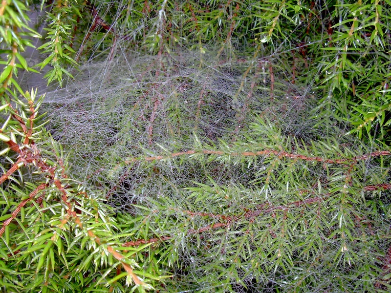 Паутина на ветках можжевельника туманным утром