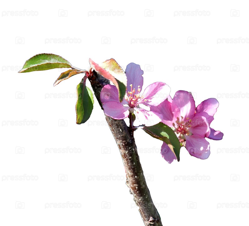 Цветущая ветка яблони с розовыми цветами - изолят на белом фоне