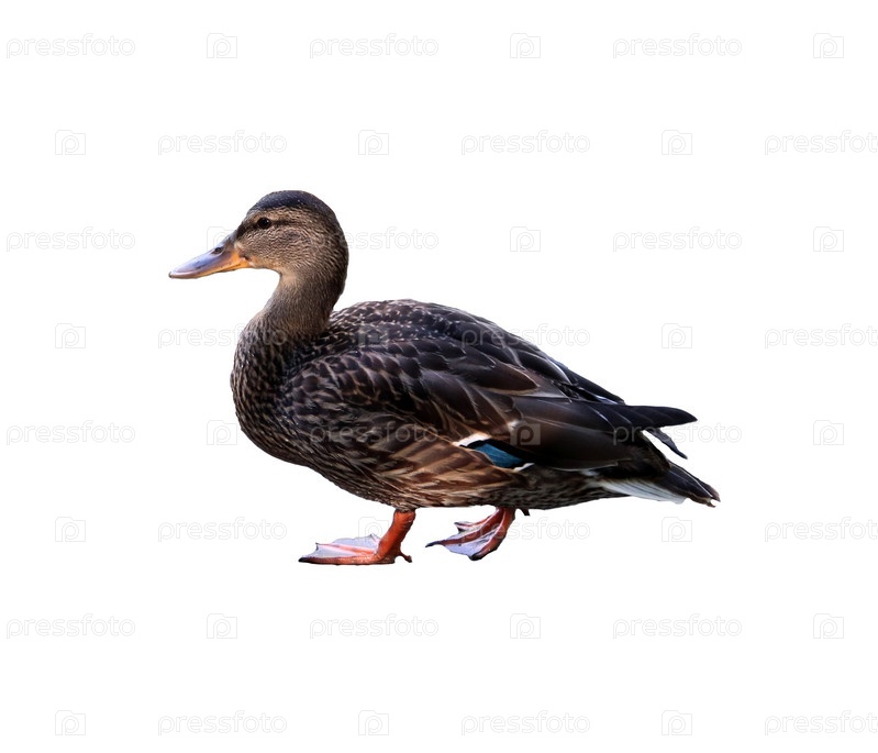 Утка кряква шагает влево, птица в профиль - изолят на белом фоне