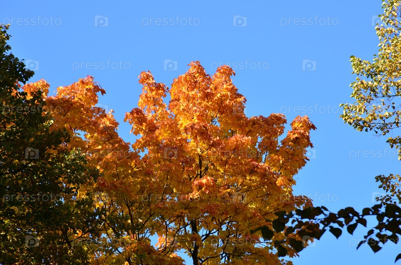 Яркая осенняя листва клена на фоне голубого неба: фоновое изображение