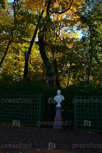 Вид на осенний Летний сад: бюст римского императора Траяна