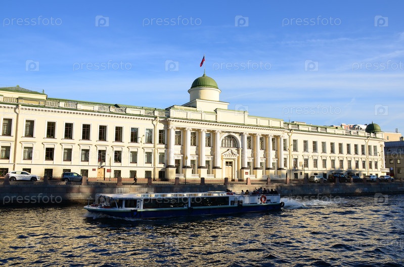 Здание Императорского училища правоведения на набережной реки Фонтанки в Санкт-Петербурге, в настоящее время расположен Ленинградский областной суд. Мимо проплывает прогулочный экскурсионный кораблик