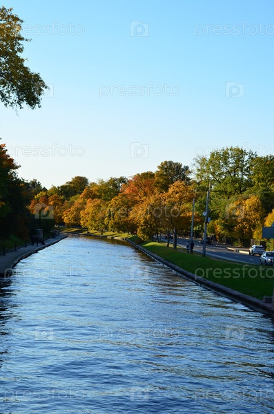 Осенний вид на реку Карповка в Санкт-Петербурге: понтон, разноцветные деревья, спокойная вода