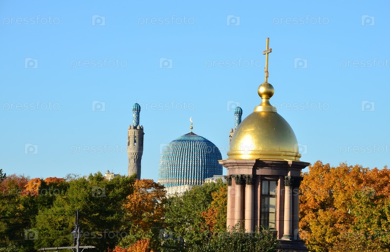 Соборная мечеть и Церковь-часовня Троицы Живоначальной – православный храм на Троицкой площади в Санкт-Петербурге в осенний день