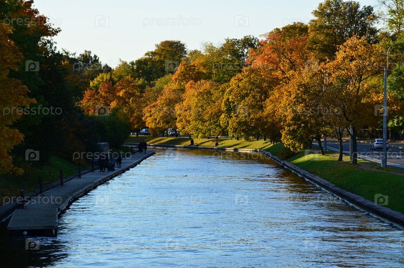 Осенний вид на реку Карповка в Санкт-Петербурге: понтон, разноцветные деревья