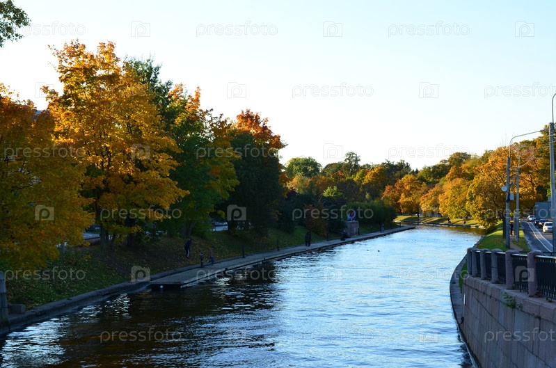 Осенний вид на реку Карповка в Санкт-Петербурге: понтон, разноцветные деревья