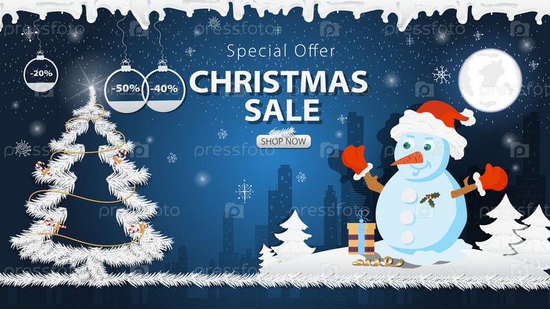 Баннер специальное предложение Рождественская распродажа Снеговик в шапке Санта-Клауса рядом с праздничной елкой в снегу