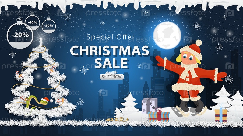 Баннер специальное предложение Рождественская распродажа Девочка в костюме Санта-Клауса катается на коньках рядом с праздничной елкой в снегу