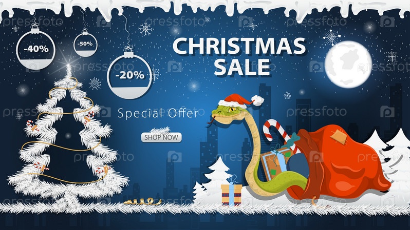 Баннер специальное предложение Рождественская распродажа Змея в шапке Санты выползает из мешка с подарками рядом с праздничной елкой в снегу