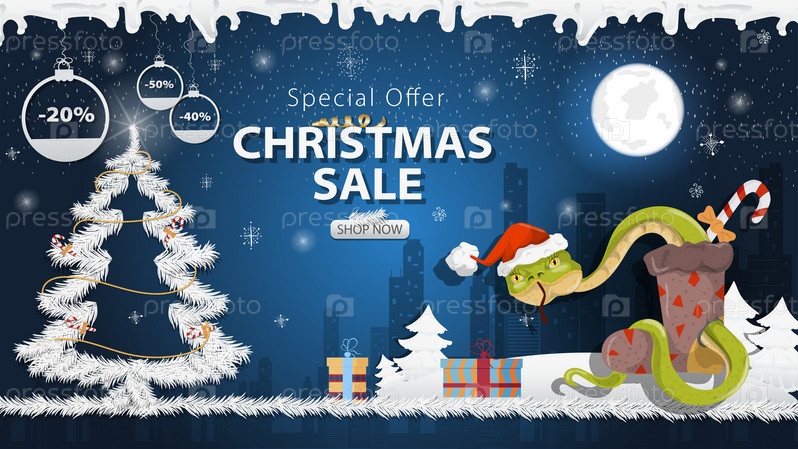 Баннер специальное предложение Рождественская распродажа Змея в шапке Санты выползает из подарочного носка рядом с праздничной елкой в снегу