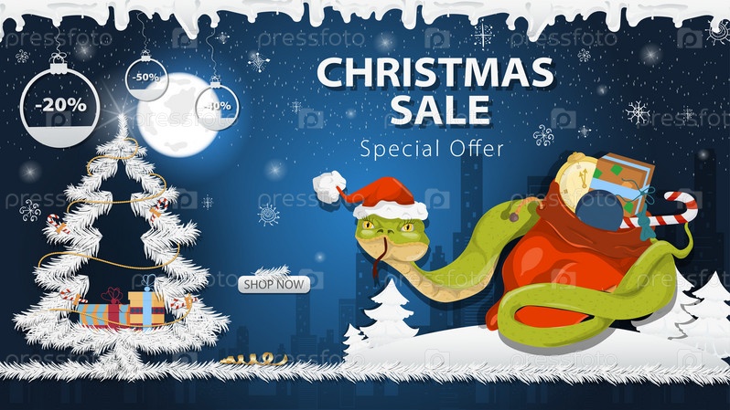 Баннер специальное предложение Рождественская распродажа Змея в шапке Санты обвивает мешок с подарками рядом с праздничной елкой в снегу