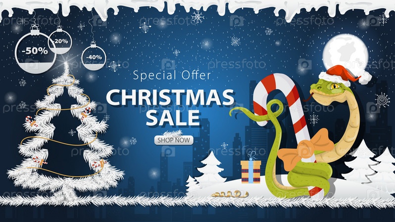 Баннер специальное предложение Рождественская распродажа Змея в шапке Санты обвивает праздничную конфету рядом с праздничной елкой в снегу