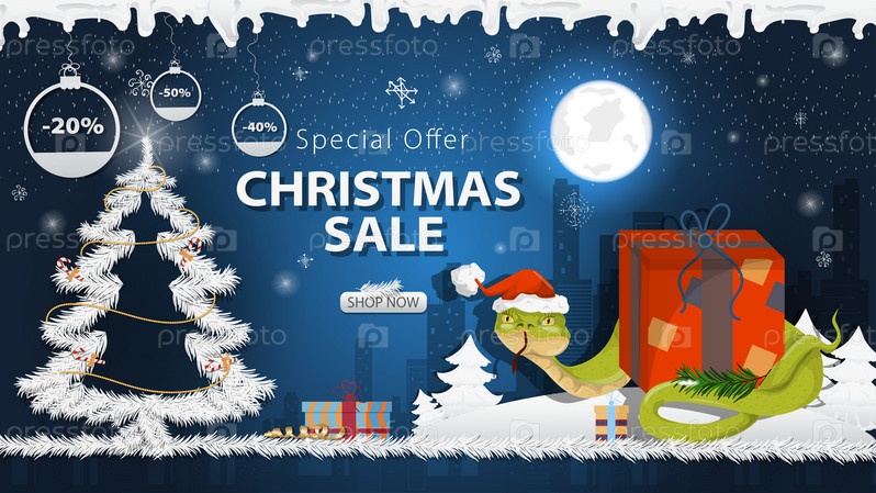 Баннер специальное предложение Рождественская распродажа Змея в шапке Санты обвивает подарочную коробку с праздничной елкой в снегу