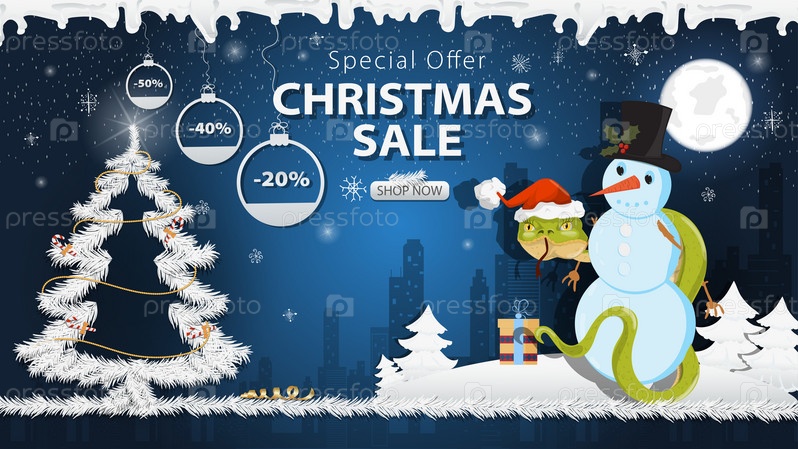 Баннер специальное предложение Рождественская распродажа Змея в шапке Санты обвивает снеговика рядом с праздничной елкой в снегу